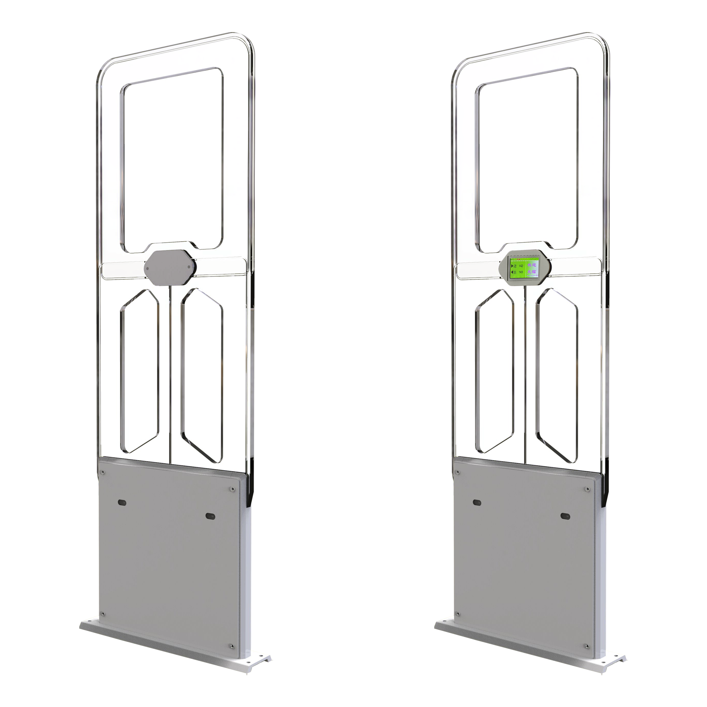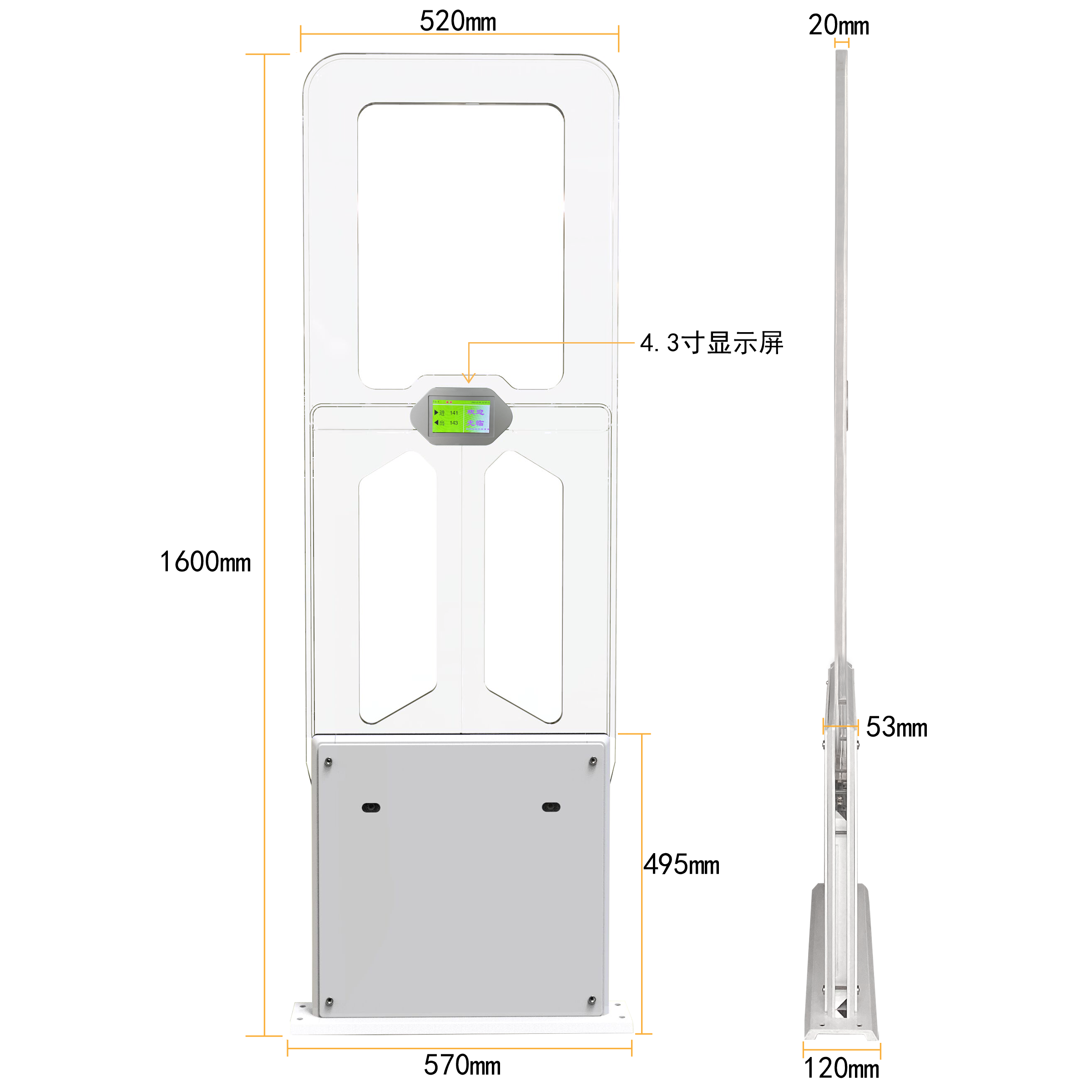 屏显功能:自主创新自带4.3寸显示屏功能(包含:日期、时间、人员进出流量数据、定制使用方LOGO图文、报警图文、安全门编号)