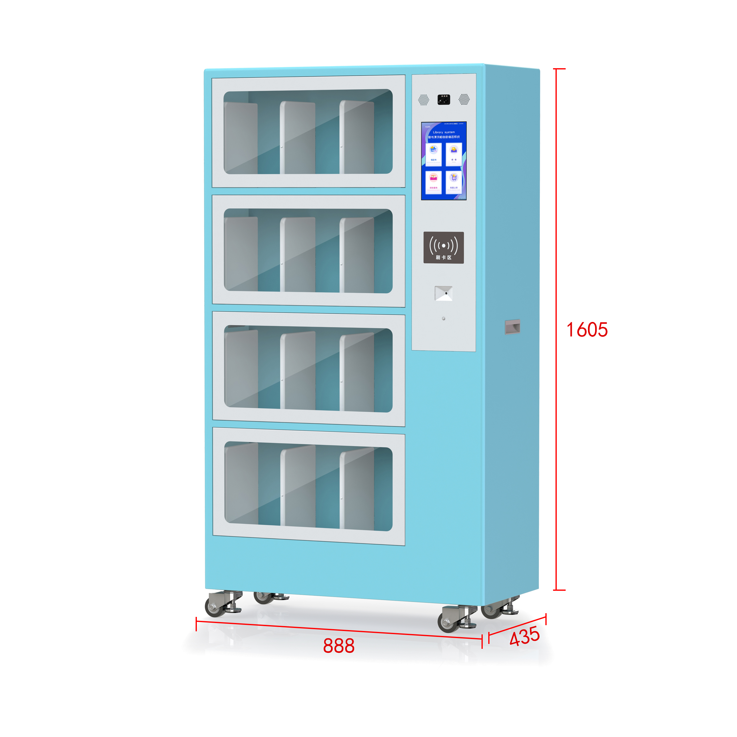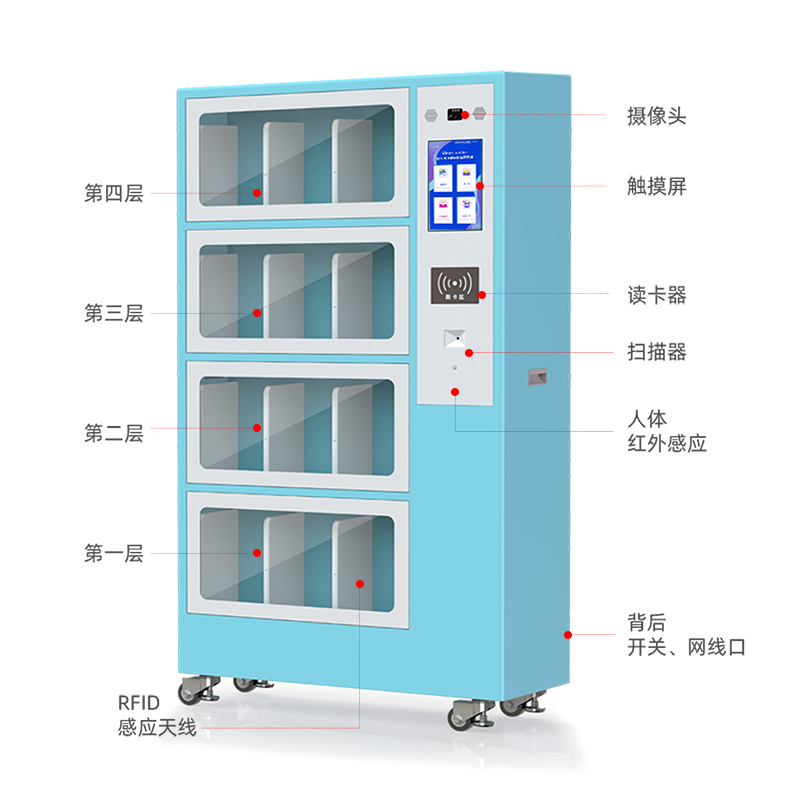 D5WT01微型图书馆智能书柜是一种基于RFID技术的图书自助借阅延伸服务的终端设备,可实现24小时无人看守的共享的智能化设备,可自助借还书、自动数据记录分析、自助提醒等一体化管理服务功能。配备触摸显示屏或简单操作的人机交流界面、图形界面,通过协议或其他网络及专用接口与图书馆自动化系统数据相连接,由读者在图书柜中借阅书籍资料;实现多区域投放,增进图书流通速率、简化借还流程,便利读者快速准确的完成借还。主要应用于校园图书一角、商圈、事业单位、图书馆党群服务中习等多领域。