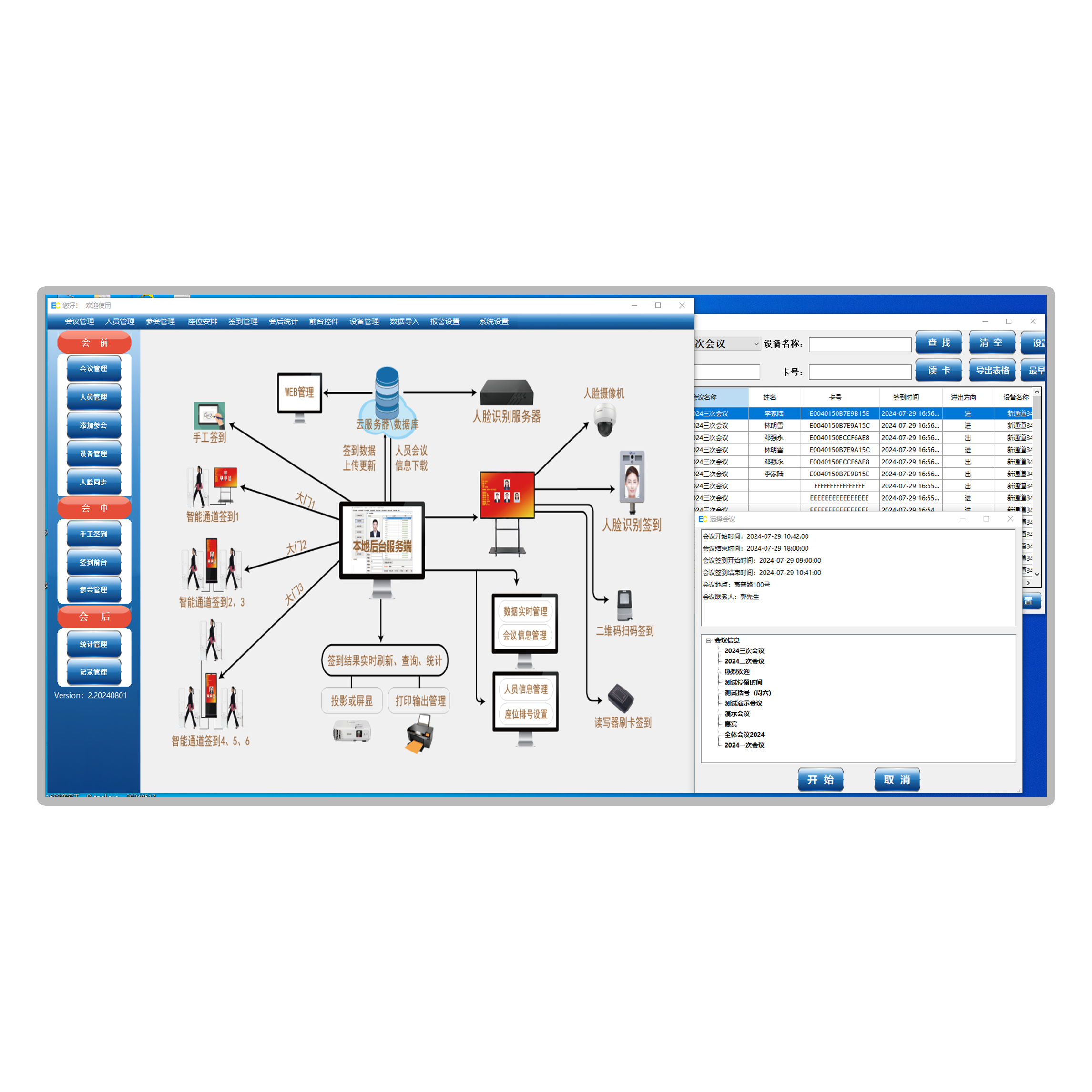 严进宽出,统计参会停留时长,实时投屏参会数据,显示未到人员,人脸识别+RFID感应识别双重认证,防止代打开代签到,可云端部署或者内网部署服务器,各客户端实时共享更新数据;可设置多个分会场按地点时间进行分会议场次切换;增加参会人员各会议进出停留时间累计统计功能;设置同步第三方实时签到数据上传下载功能;选配联网版还是下载数据切换本地版功能,本地版可实时上传下载数据;增加人脸识别签到功能,增加RFID+人脸识别双重认证签到功能;增加签到认证成功联动外部设备闸机开闸放行功能;完善各种签到状态不同声光报警提示功能可选配;