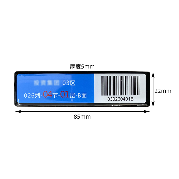 RFID图书层架标签,是为智能图书馆系统中的图书RFID标签识别模块,通过图书标签、图书层架及相应的读写器模块,可读取图书标签信息,包括图书名称、图书編号、图书类型及借阅情况等,可作为系统分拣依据,方便书籍管理。图书层架标签一般粘贴在图书货架上,可统一管理同一货架上的图书情况,通过滴胶处理,美观大方,并且加入了吸波材料,可避免金属货架对标签的影响。